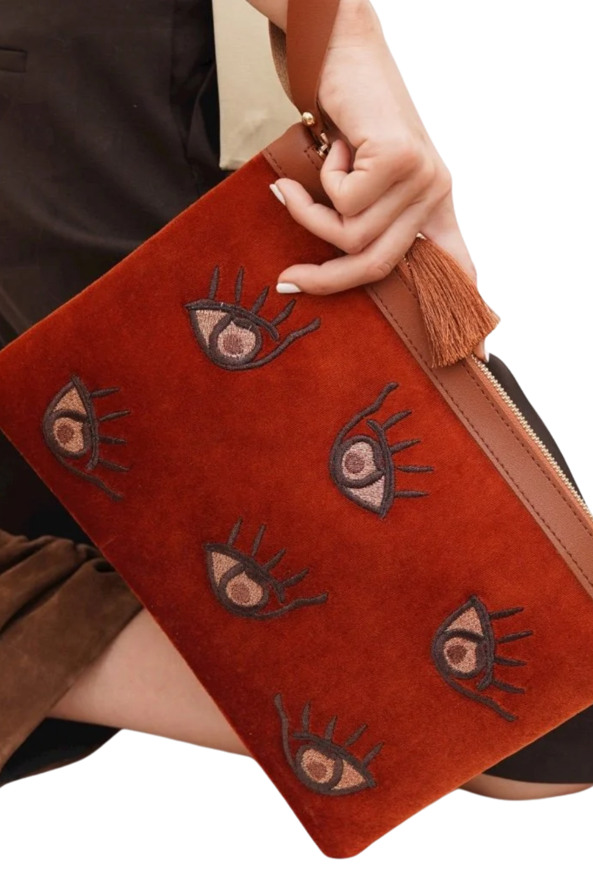 Eynaco Kadife Kahverengi Göz Nakışlı Clutch Çanta