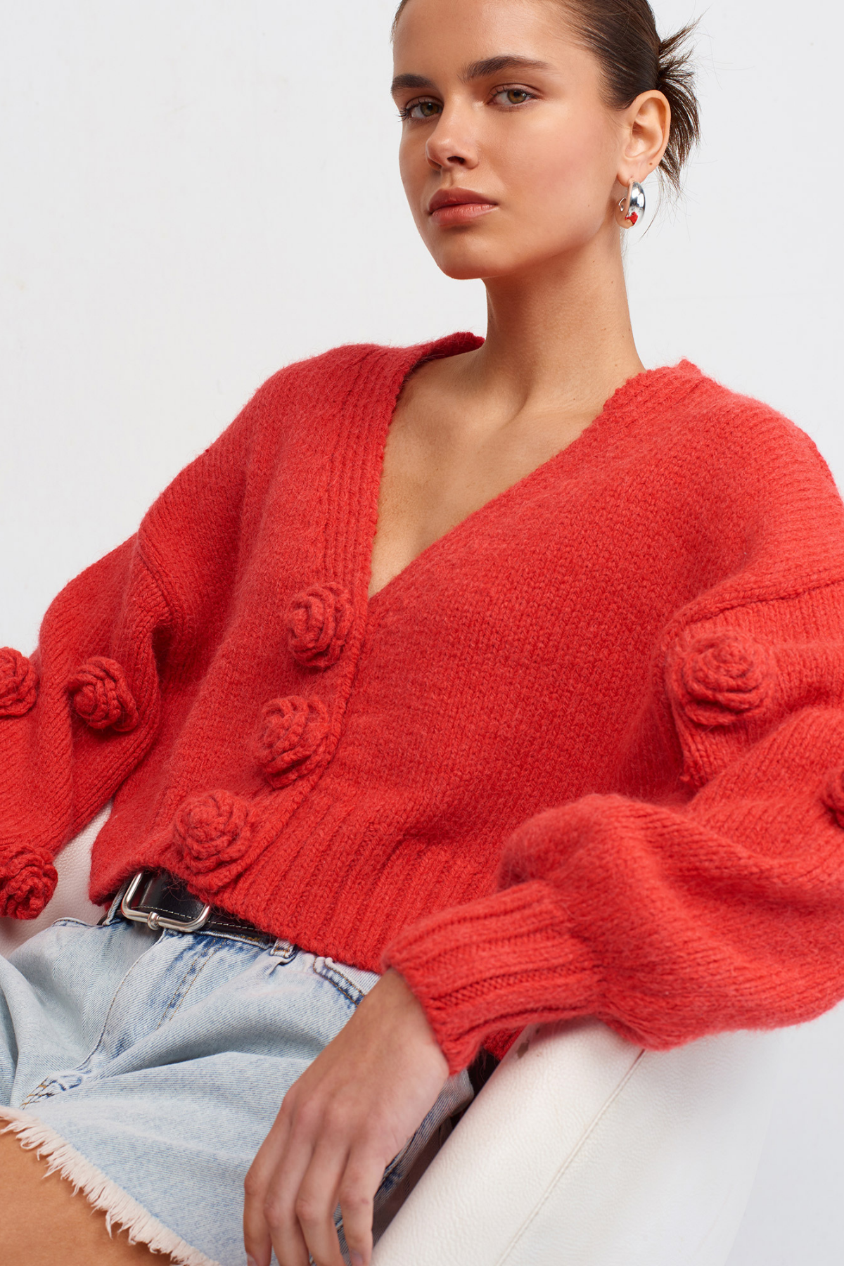 Gül Detaylı El Örgüsü Hırka Kırmızı
