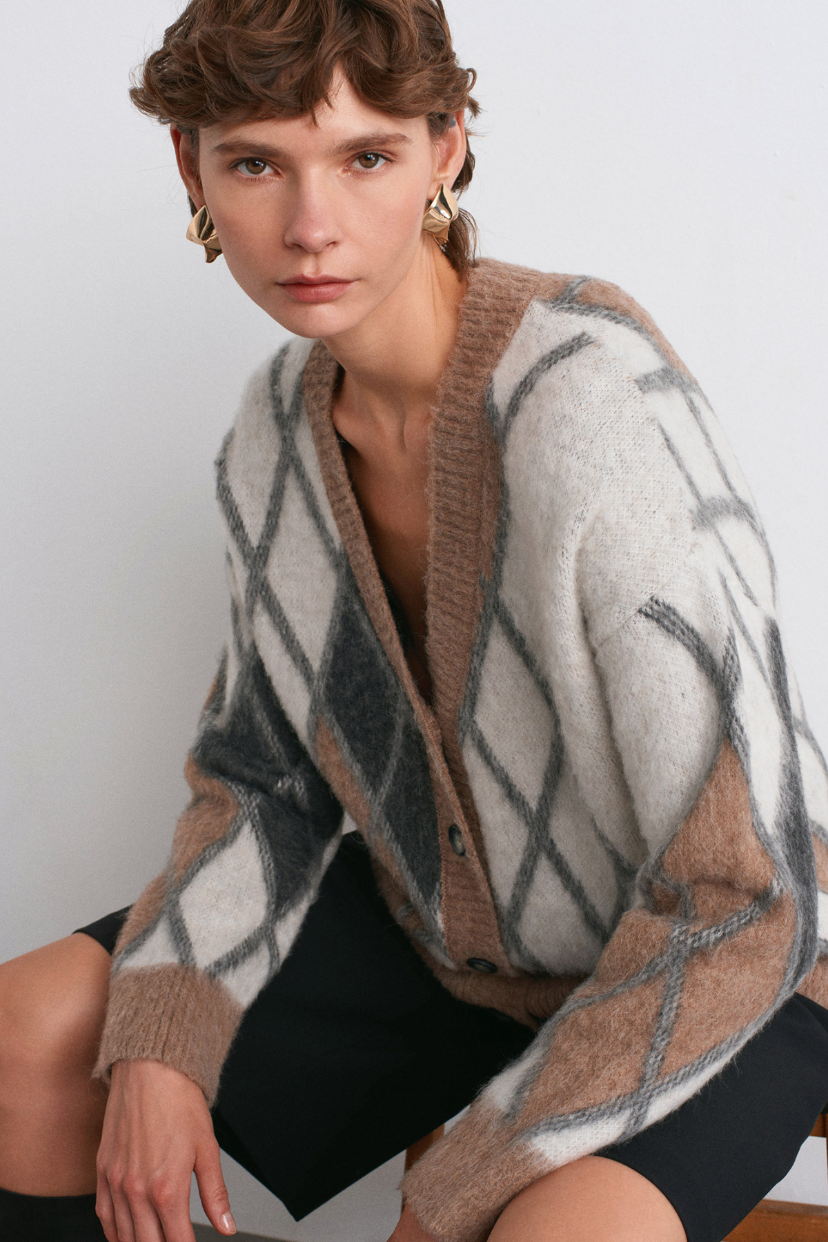 V Yaka Baklava Desenli Şardonlu Triko Hırka-Vizon